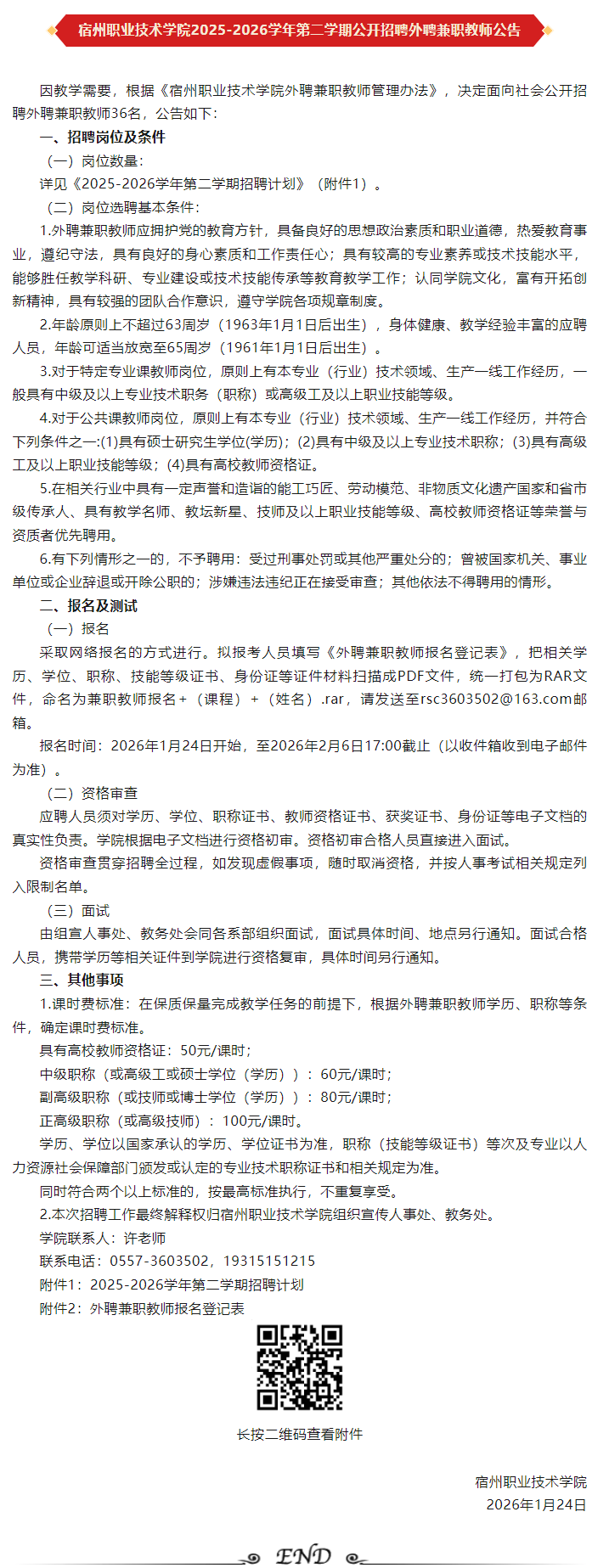 【宿州本地】兼职教师36人~最高100元/课时!宿州职业技术学院招聘公告