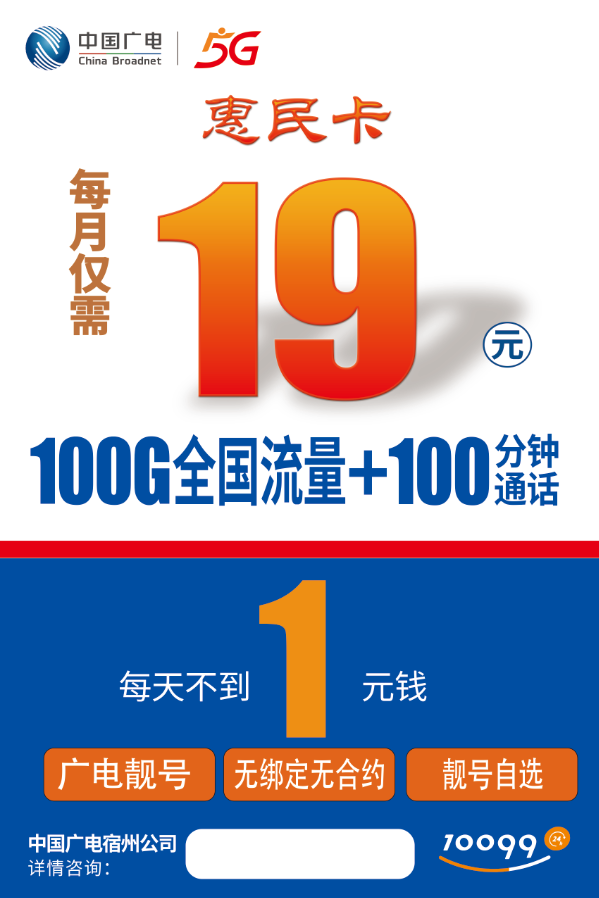 中国广电惠民卡套餐:19元/月(228元/年),每月送1年),00G全国通用00G流量+100分流量+钟主叫通话,套钟主叫餐长期有效,无餐长期任何套路。可以任何套上门选号办理,上门选上门办理再送3上门办0G流量+100G流0分钟通话(年0分钟龄18岁以上)。