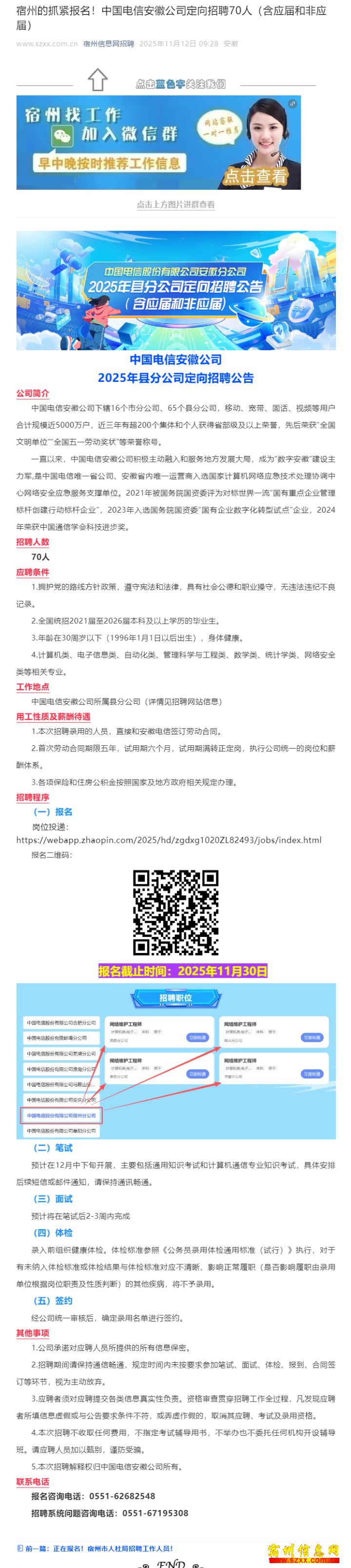 宿州的抓紧报名!中国电信安徽公司定向招聘70人(含应届和非应