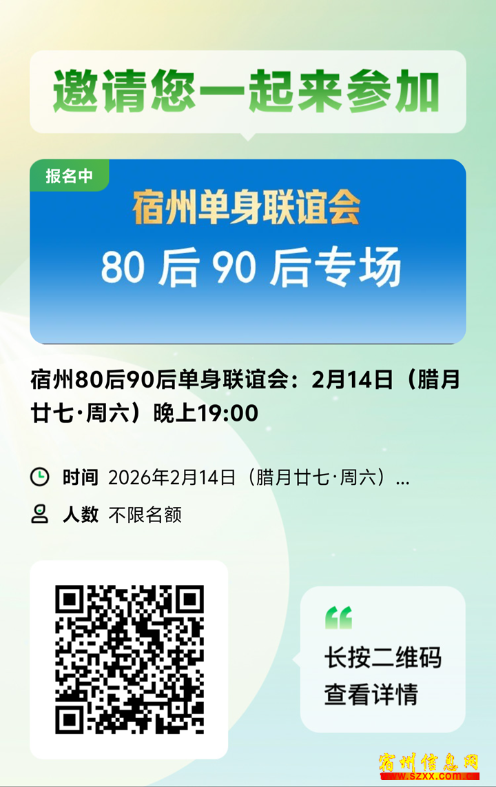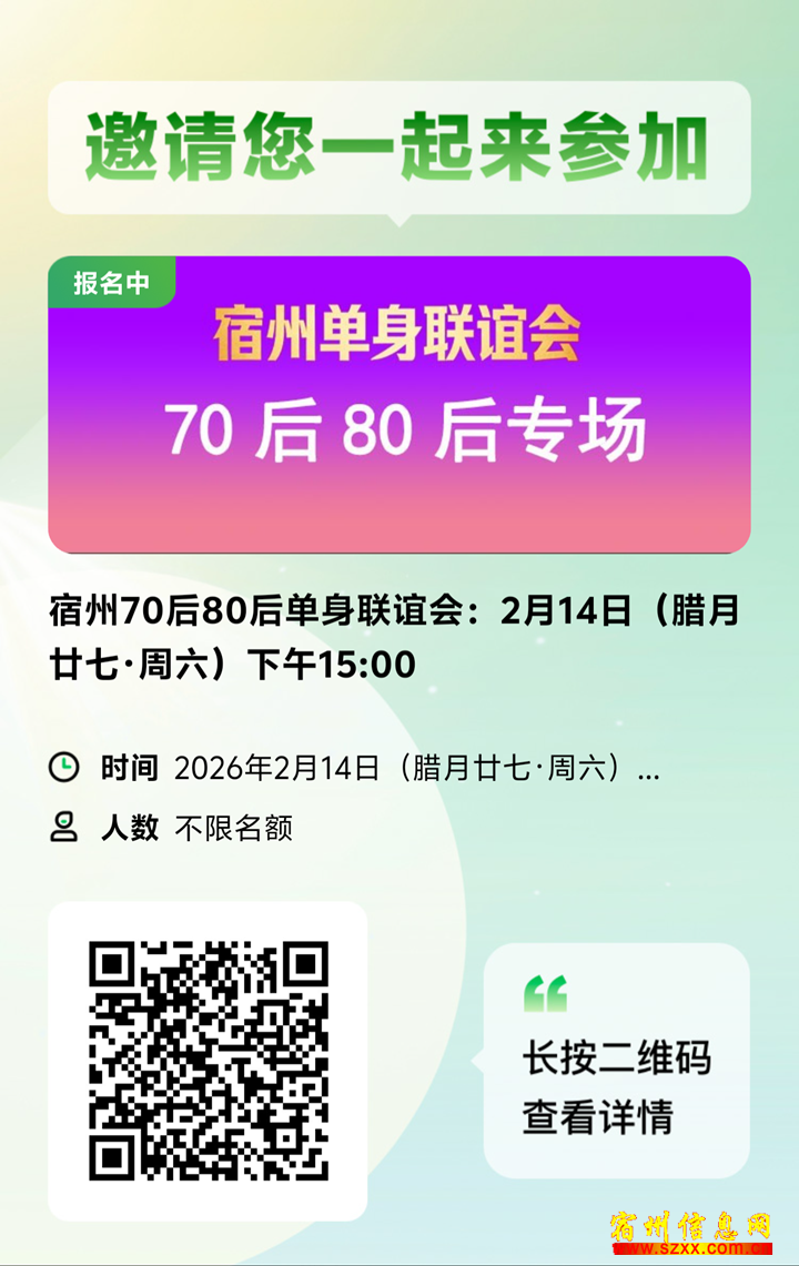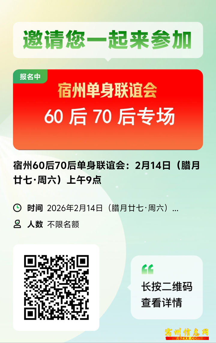 2.14(腊月廿七·周六)9:00周六)-11:00,-1160后70后单60后身联谊会。追求身联谊安稳、阅历相近的同城单身