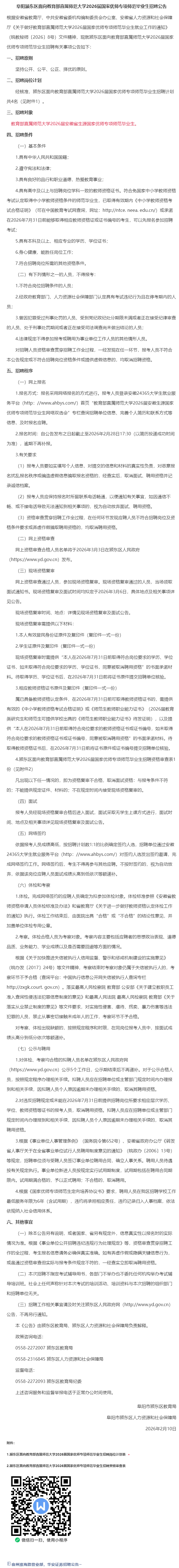 阜阳颍东区面向教育部直属师范大学2026届国家优师专项师范